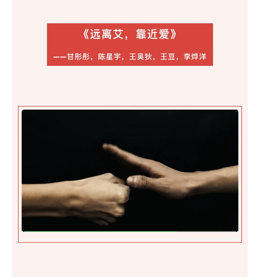 有爱青春,健康无艾。学院学生会心体部拍摄的作品短视频“远离艾,靠近爱”让人眼前一亮。视频以“两只手”形象呈现了艾滋病患者敏感自卑的无助以及社会对艾滋病患者从排斥到接纳的转变,最后用充满温情的画面提出“伸出温暖的手,感动冷漠的心”的防歧视主题。主创人员介绍,为了拍摄这则短片,团队对许多真实案例进行了了解,认识到艾滋病给患者及家庭带来的痛苦,意识到对于艾滋病患者的不理智偏见与歧视便是刺向无辜病人的一把把利剑,越发感到防艾反歧视宣教的重要性。
