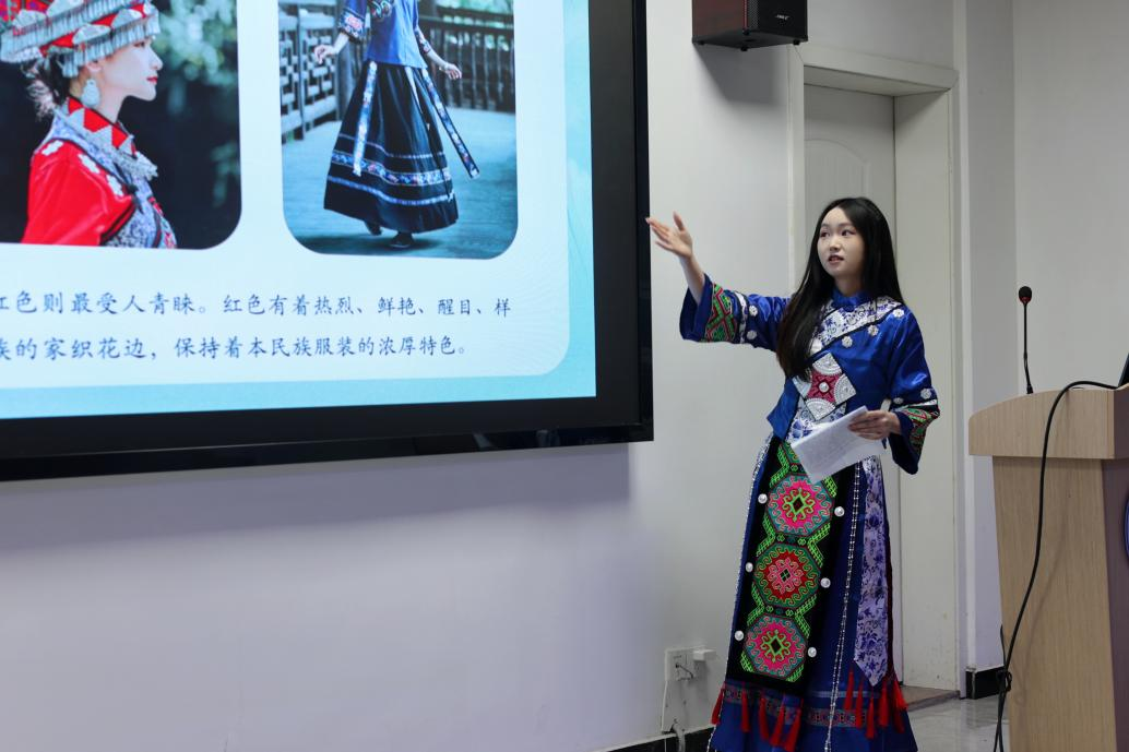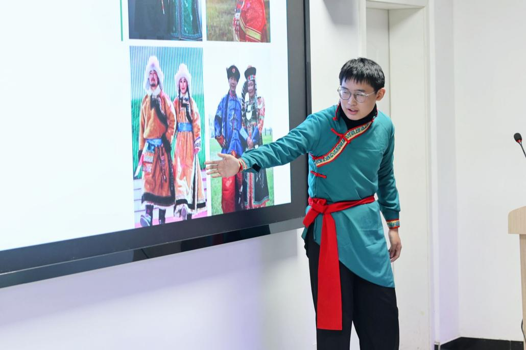 文化展示环节,学院少数民族学生化身家乡“代言人”,通过图片、视频、实物等多样化的形式展现各自家乡风土人情:蒙古族历史悠久的那达慕大会、土家族节奏明快的“摆手舞”、维吾尔族的特色美食抓饭和烤包子……为在场的每一“小小石榴籽”奉献了一场民族文化盛宴。