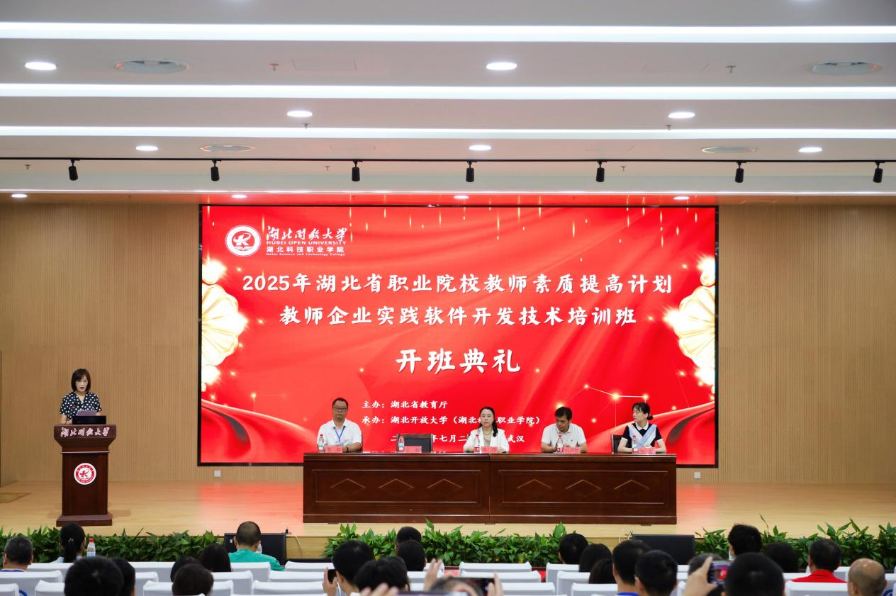 本网讯(通讯员 唐超 潘磊 文/图)7月22日上午,“2025年湖北省职业院校教师素质提高计划项目”教师企业实践软件开发技术骨干教师培训班开班典礼在湖北科技职业学院关山校区学术报告厅举行,来自湖北省内职业院校的60名骨干教师参加培训。学校党委常委肖潇,培训学院院长刘茂财,软件工程学院院长王敏、副院长杨凡和曾辉参加开班仪式,开班仪式由王敏主持。