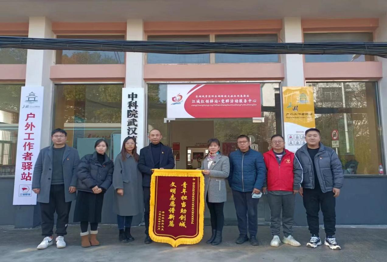 本网讯(通讯员 金垒/文 杨情 余旭 张少卿/图)一面锦旗,一份信任,一份肯定。12月5日上午,武汉市磨山社区党总支书记方燕群带领班子部分成员,为软件工程学院克勤志愿服务队赠送题为“青年担当助创城,文明志愿谱新篇”的锦旗,真诚感谢克勤志愿服务队大学生志愿者近年在来社区志愿服务活动中给予广大居民的热心帮助。院党总支书记郝锐代表学院接受锦旗并向社区表示感谢,学院相关负责老师及部分志愿者代表参加赠旗活动。