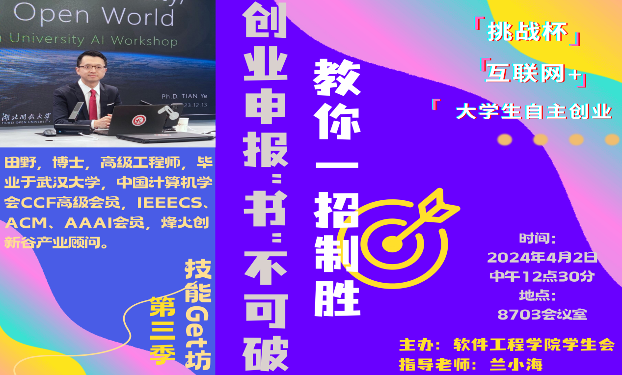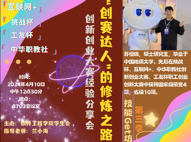 本网讯(兰小海/文 邹世康 孟广娟/图)2024年4月,由软件工程学院主办的特色系列活动“技能Get坊”拉开帷幕。本季活动主题聚焦大学生创新创业,旨在激发同学们的创业热情,提升创新创业能力,助力青年学子在创业之路上破浪前行、逐梦远航。